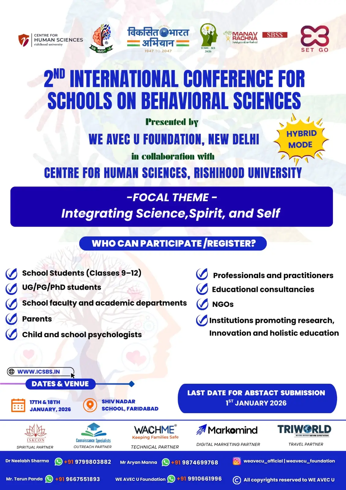 We at WE AVEC U Foundation are delighted to invite you to the International Conference for Schools in Behavioral Sciences. As a youth-led nonprofit organization devoted to mental health awareness and education, our vision is to empower students and teachers to explore the frontiers of psychology and behavioral sciences. This conference reflects our commitment to inspiring young minds, foster academic curiosity, and build a community passionate about understanding human behavior. We warmly welcome you to join us in this inspiring journey of learning, sharing, and growth.
